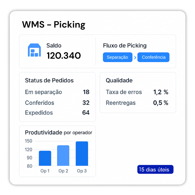 Controle total do armazém, da entrada ao faturamento, com a robustez de um sistema enterprise e o ritmo de quem tá crescendo.
